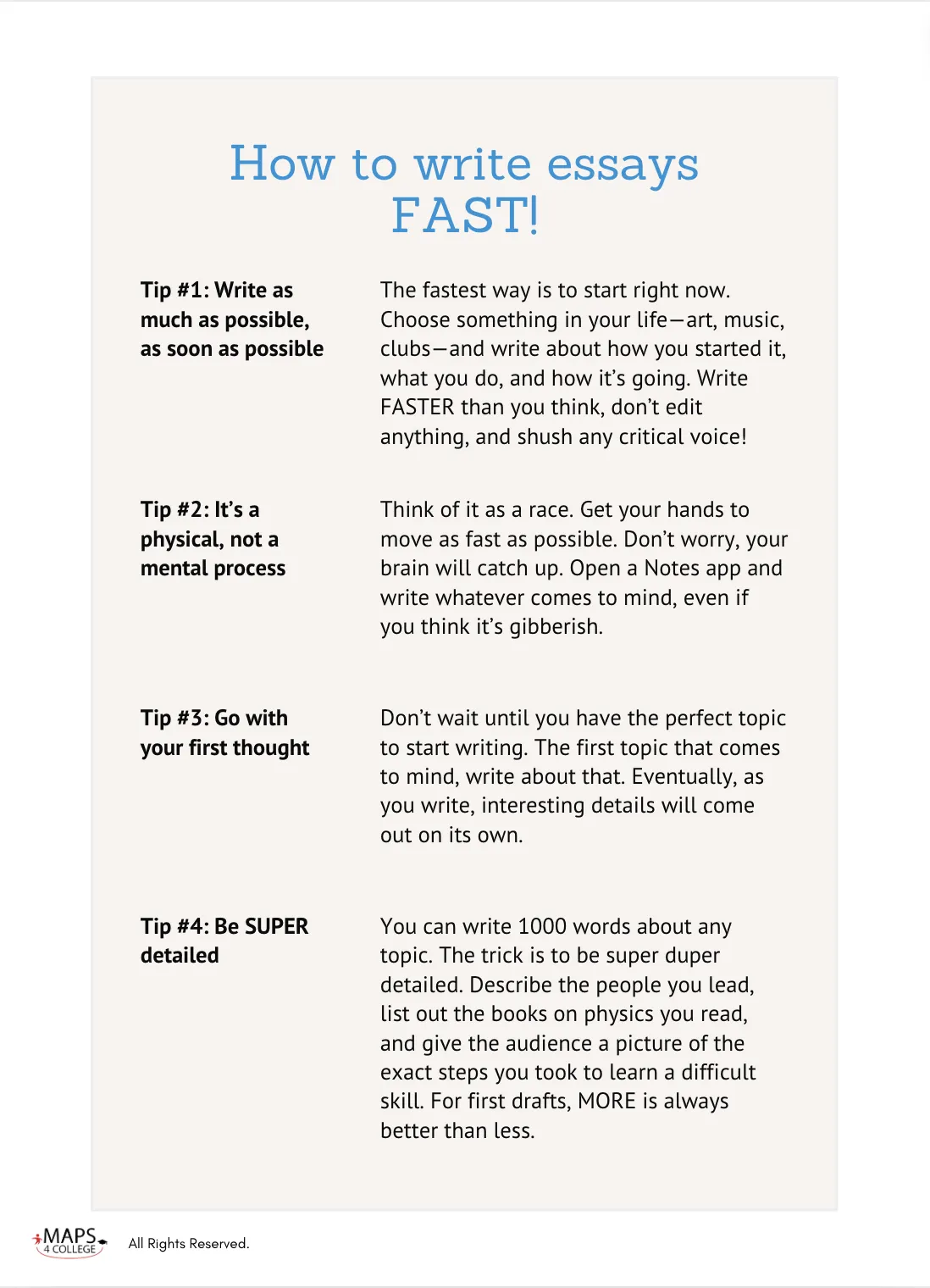 Avoid overthinking and procrastination. There are tips and ways to write fast AND strong essays. With our tangible examples, you'll have your UC application done in no time.